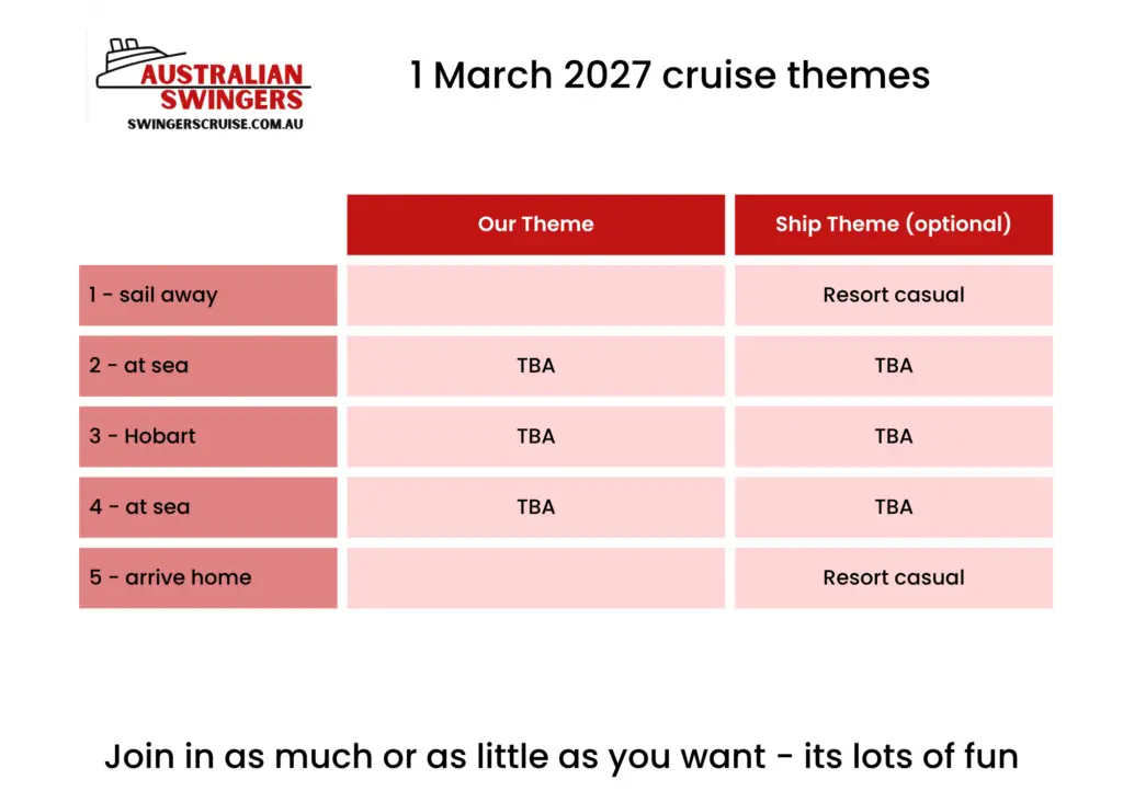 Departing Sydney on 1 March 2027, this four-night swingers cruise to Hobart is the perfect way to extend the adventure — or jump in for a fun, social escape.