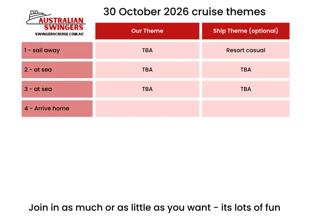 Departing Sydney on 30 October 2026, this cheeky three-night swingers cruise is all about great company, playful energy, and a little something extra at sea.