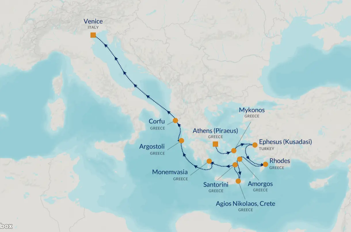 Set sail on an unforgettable 11-night journey through the heart of the Greek Isles aboard Azamara Onward, cruising from Athens to Venice. This immersive “Greece Intensive” itinerary is designed to go beyond the typical Mediterranean cruise, with extended stays and unique ports that allow you to truly experience each destination.